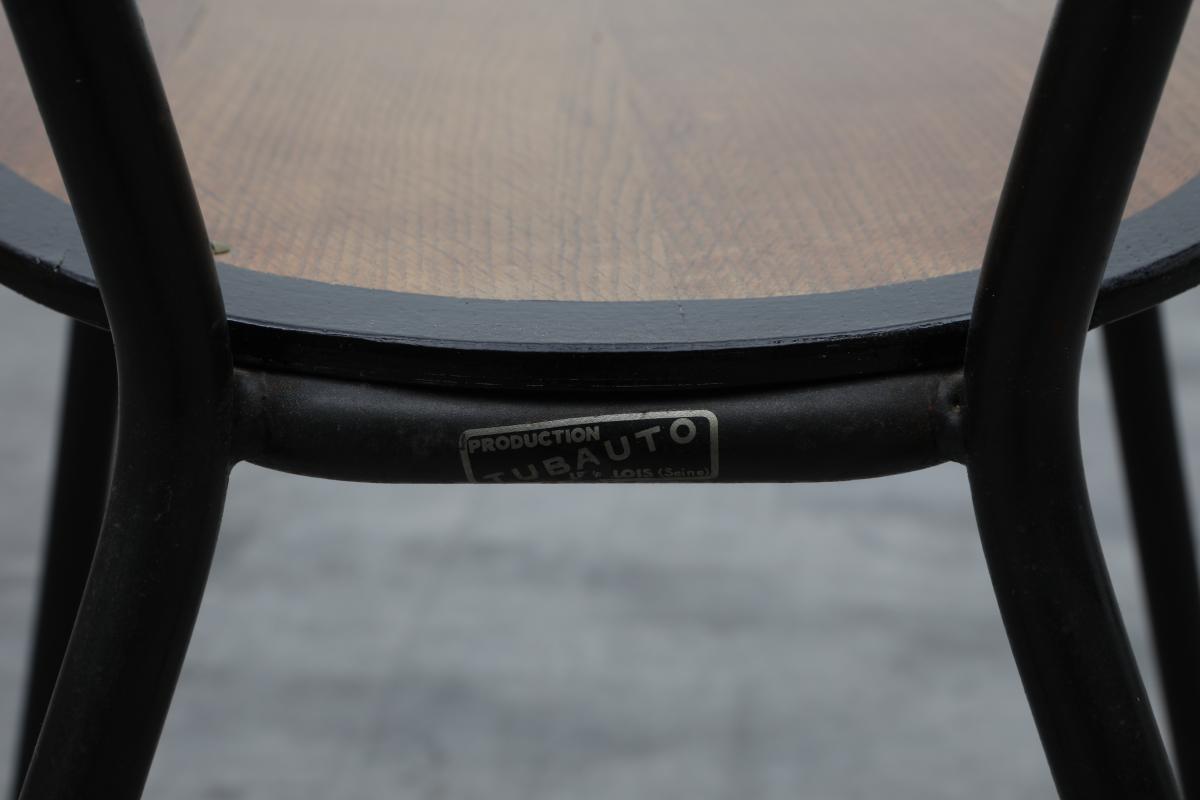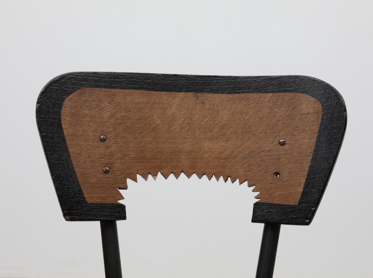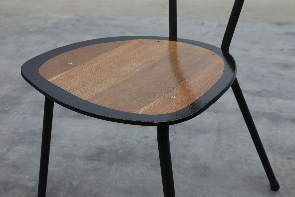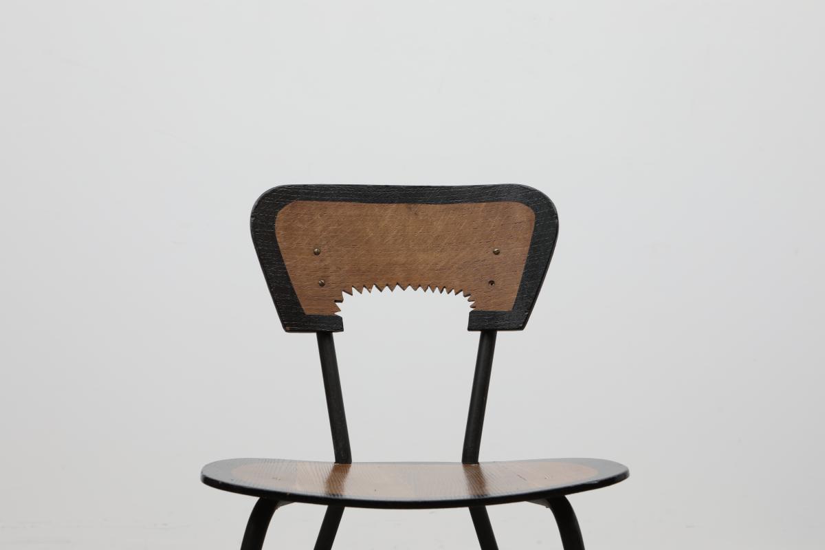 Originaly designed by Jaques Hitier who took L’équipement de l’habitation a step further, produced by Tubeauto in 1956. Backrest cut in cogwheel technic, black outlines on edges and finished in organic varnish.