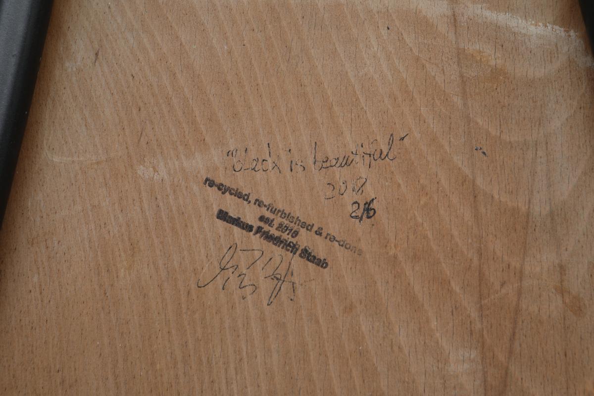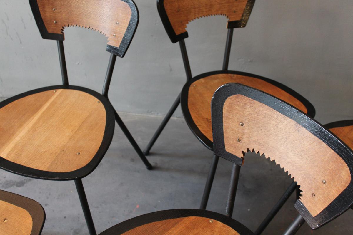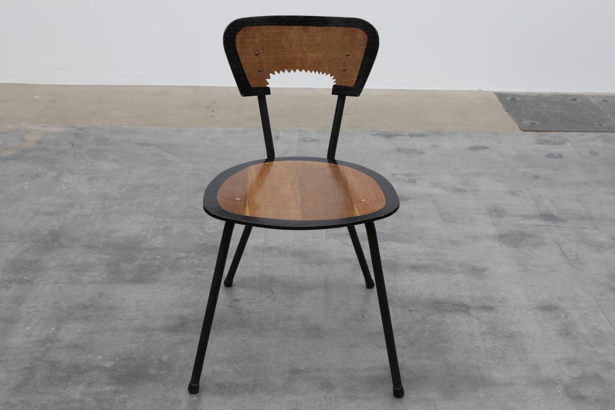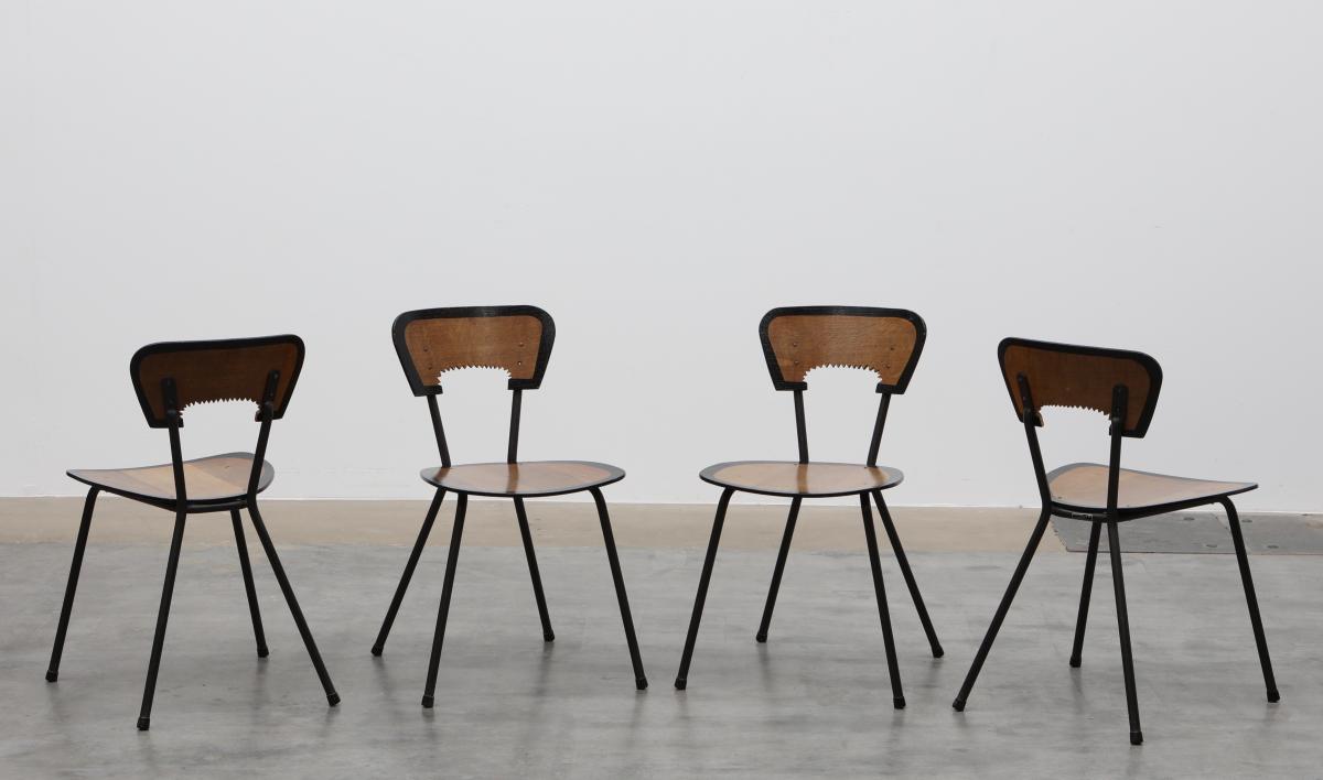 Originaly designed by Jaques Hitier who took L’équipement de l’habitation a step further, produced by Tubeauto in 1956. Backrest cut in cogwheel technic, black outlines on edges and finished in organic varnish.