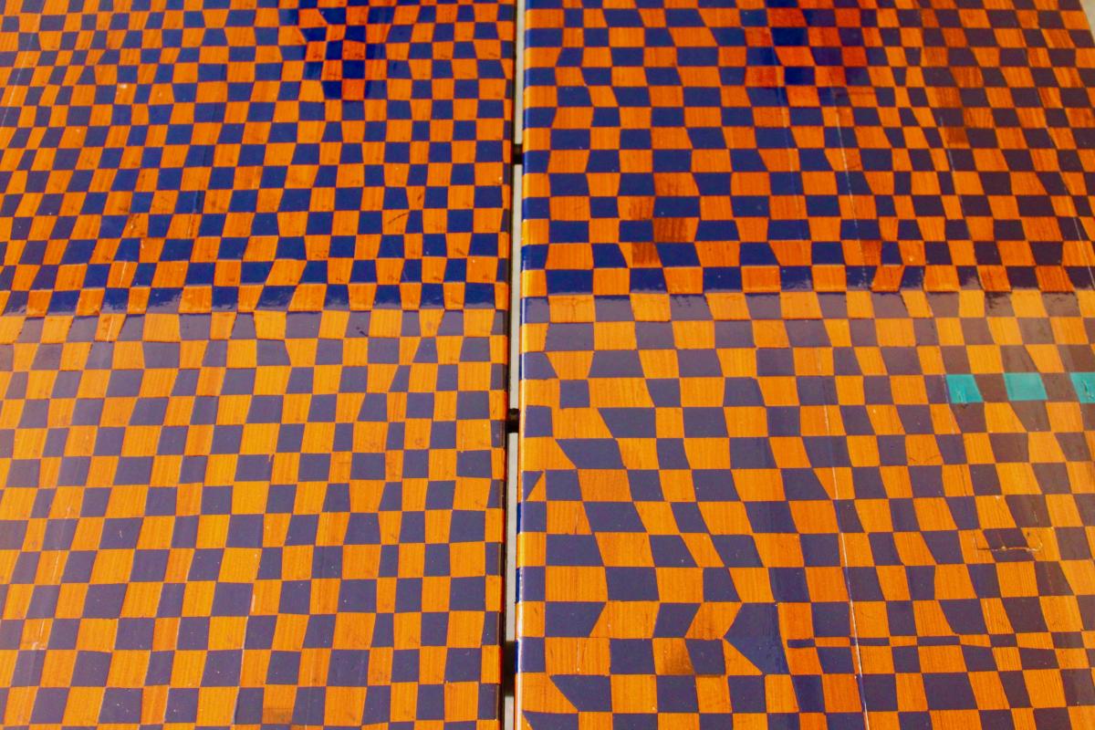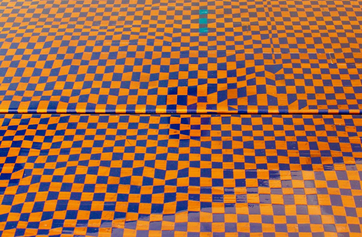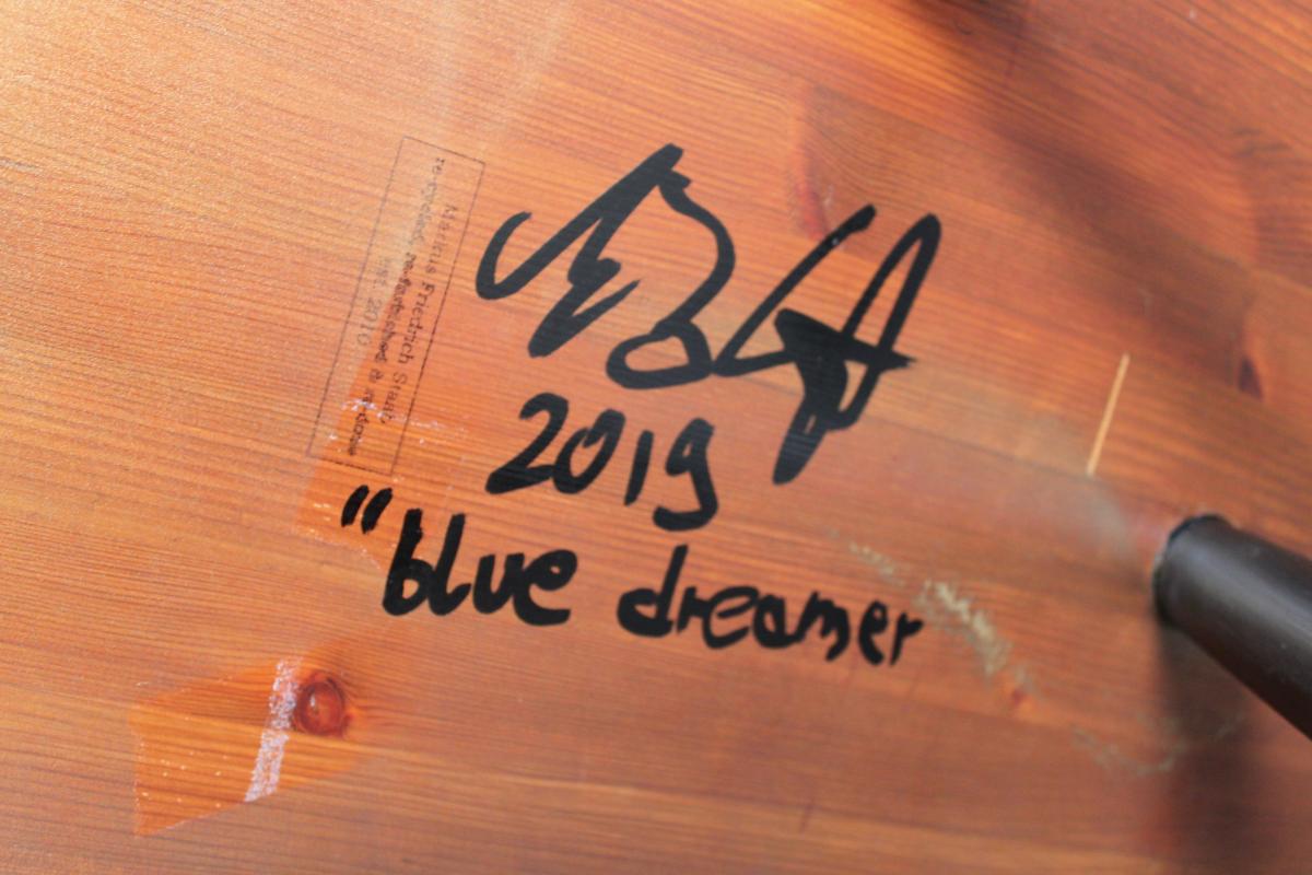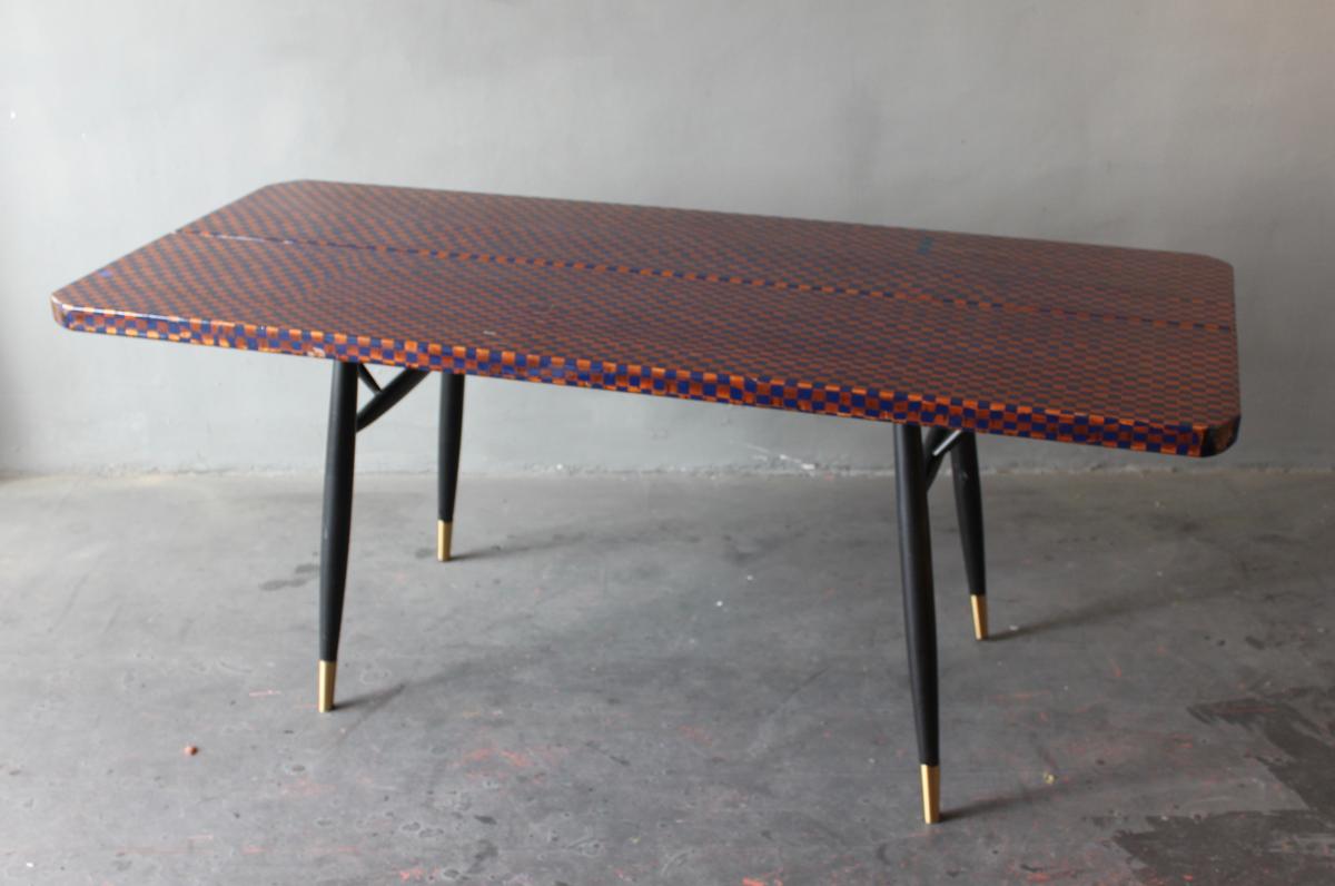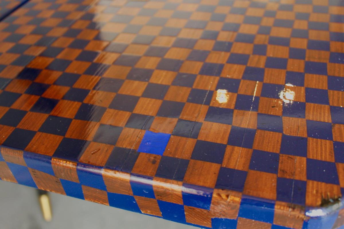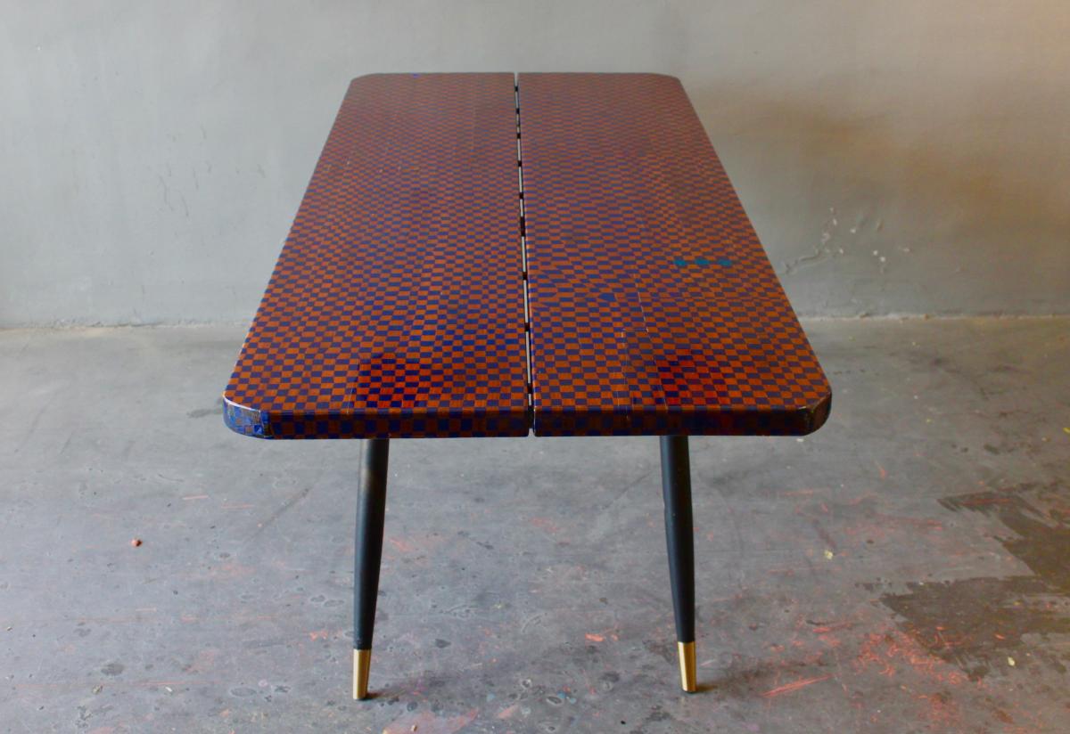 The Pirkka table has been 5cm highered by adding brass feet to give appropriate hights. Table corners are rounded to avoid the original industrial fabrication and give the piece singularity. Inperfectly perfect hand painted table top in a blue nonrecurrent pattern, multi-lacquered finish in high gloss 2K lacquer.