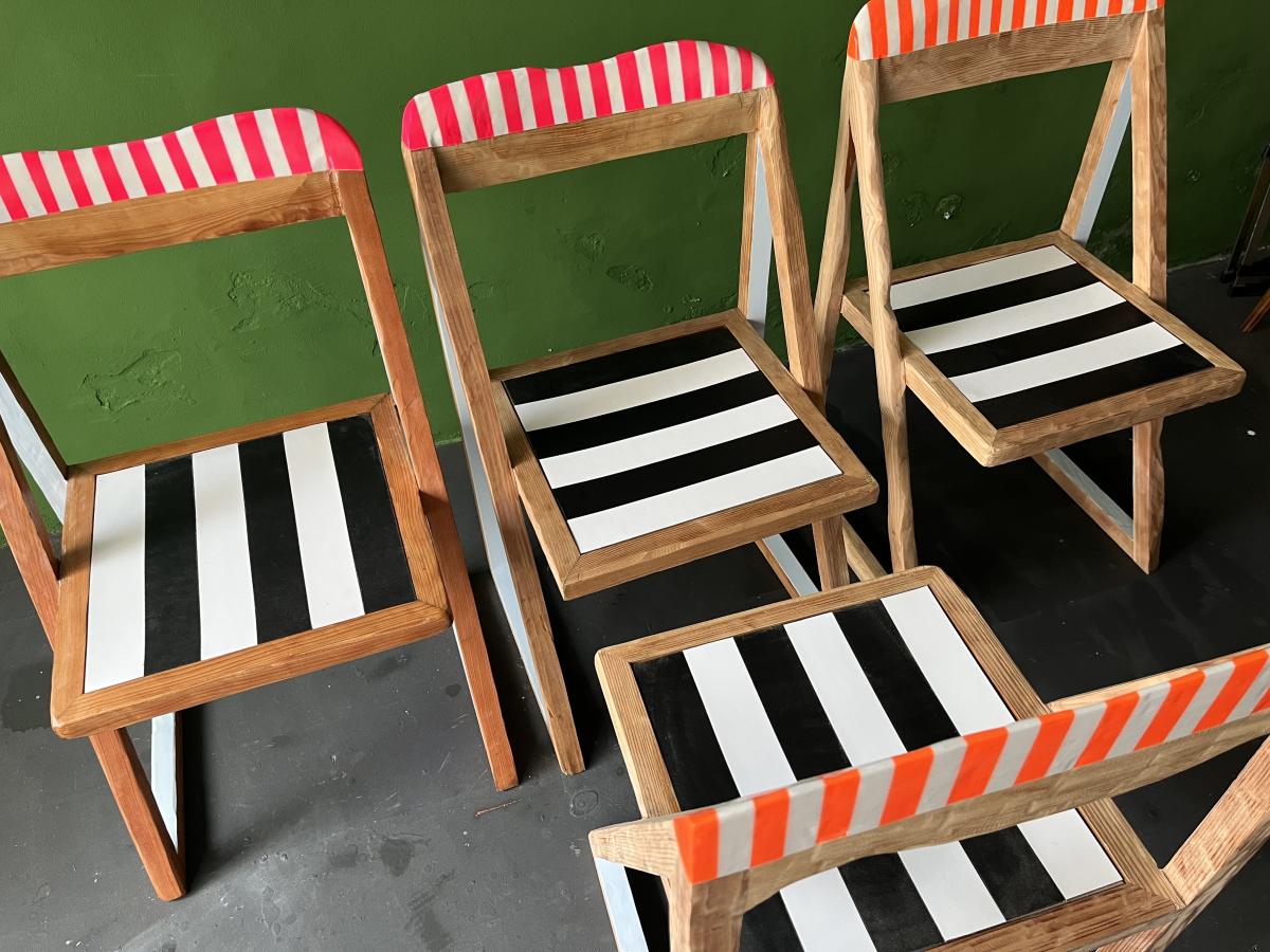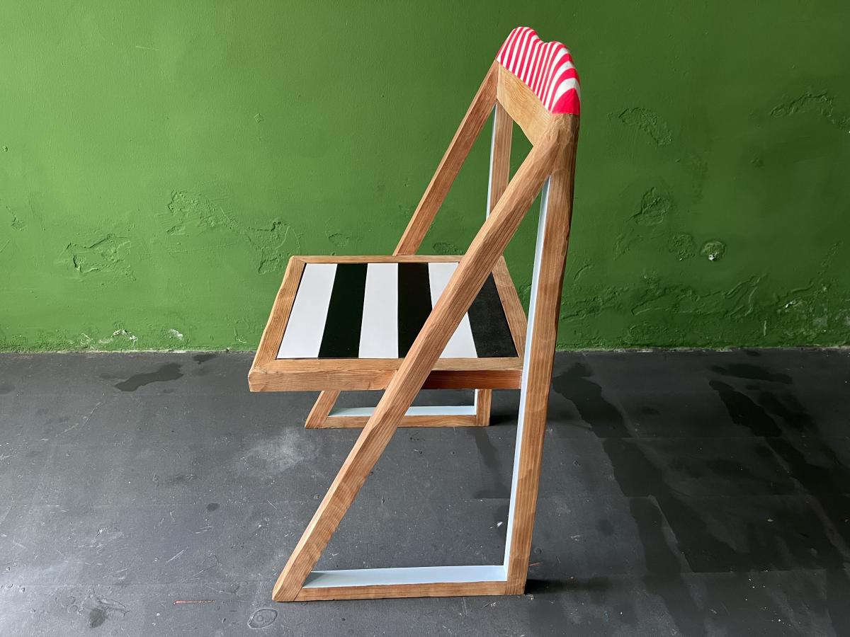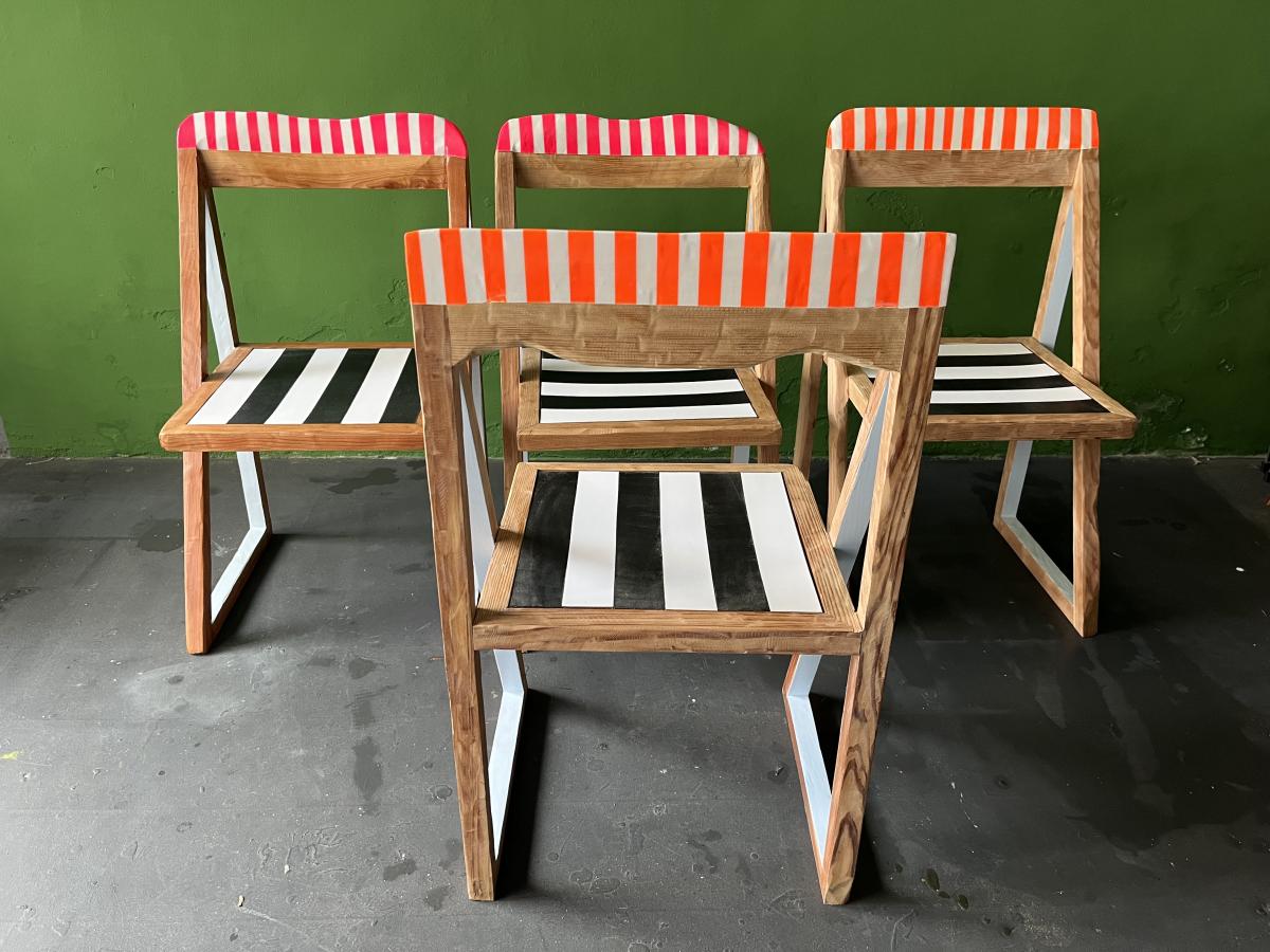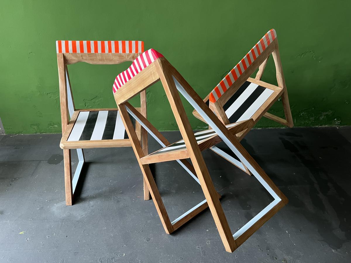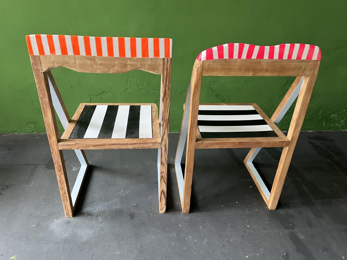 Color my world/ set of 2 These triangle chairs where re-shaped, colored in neon and white, multilacquered, black and white leather strips on the seat. Origin Germany Year 2023 PreviousNext