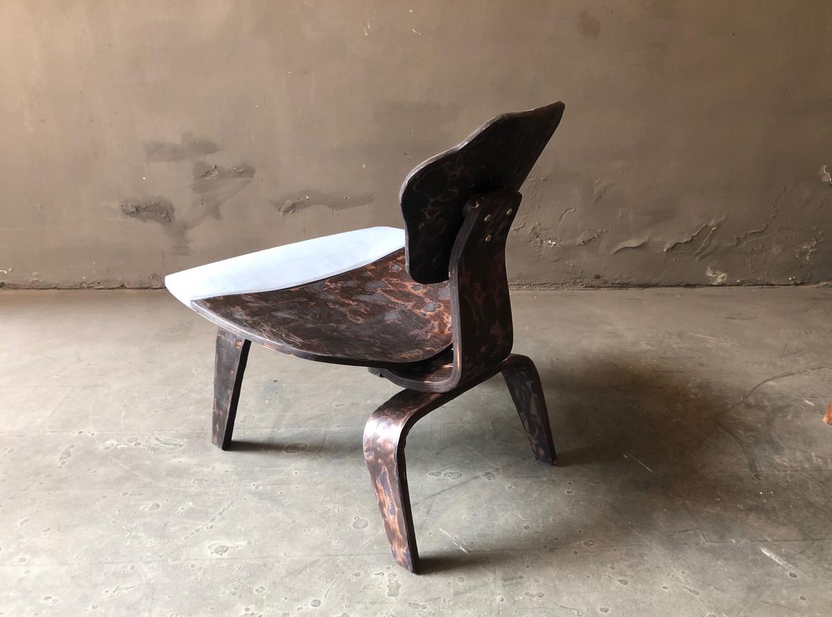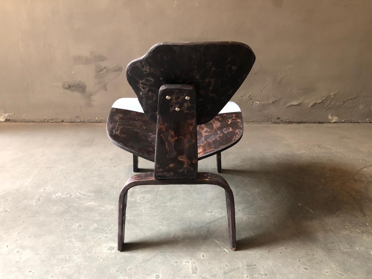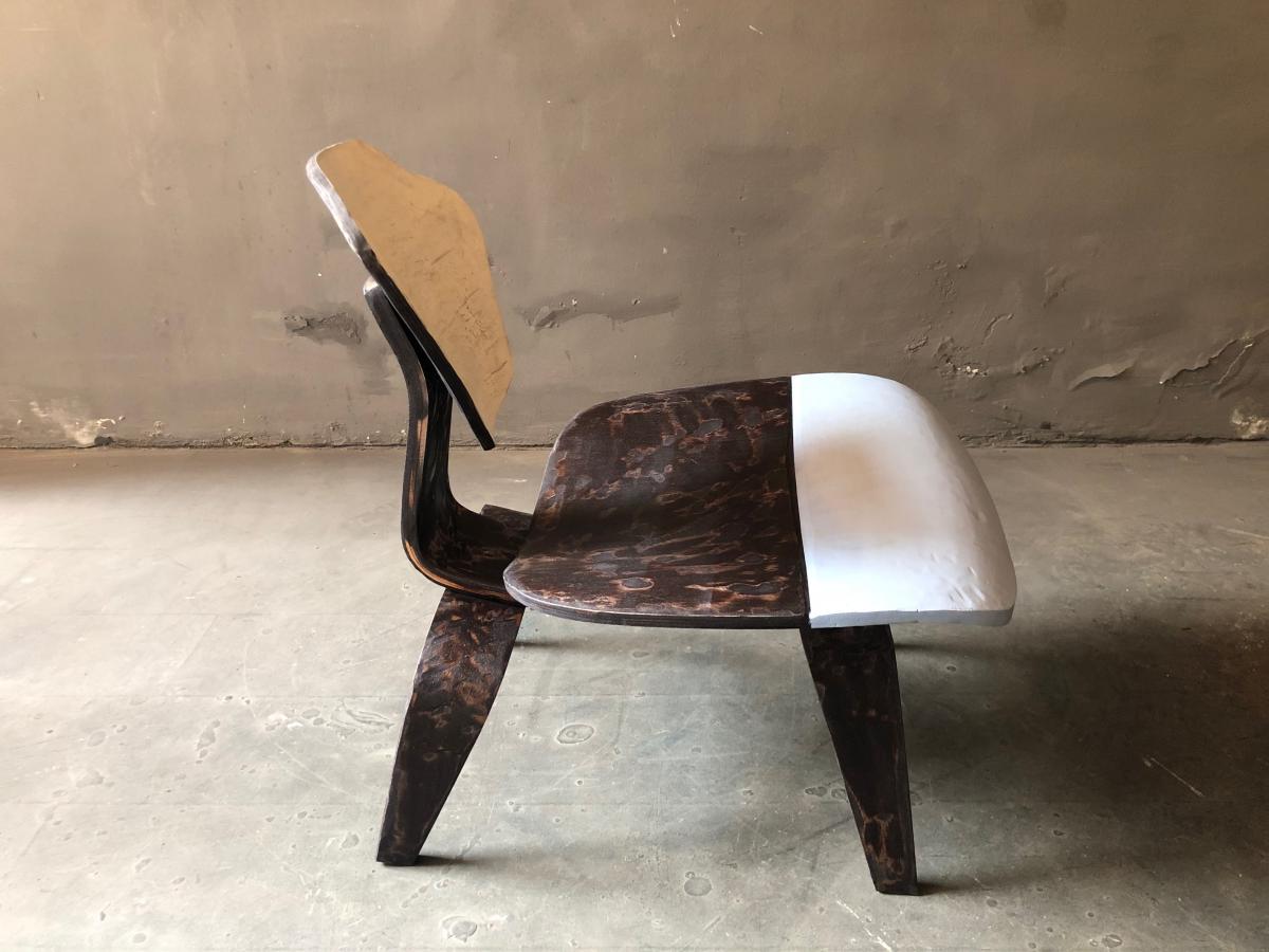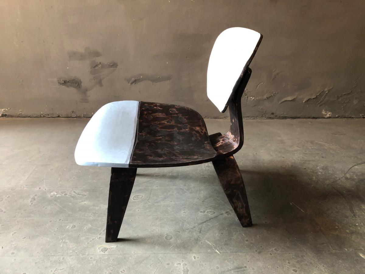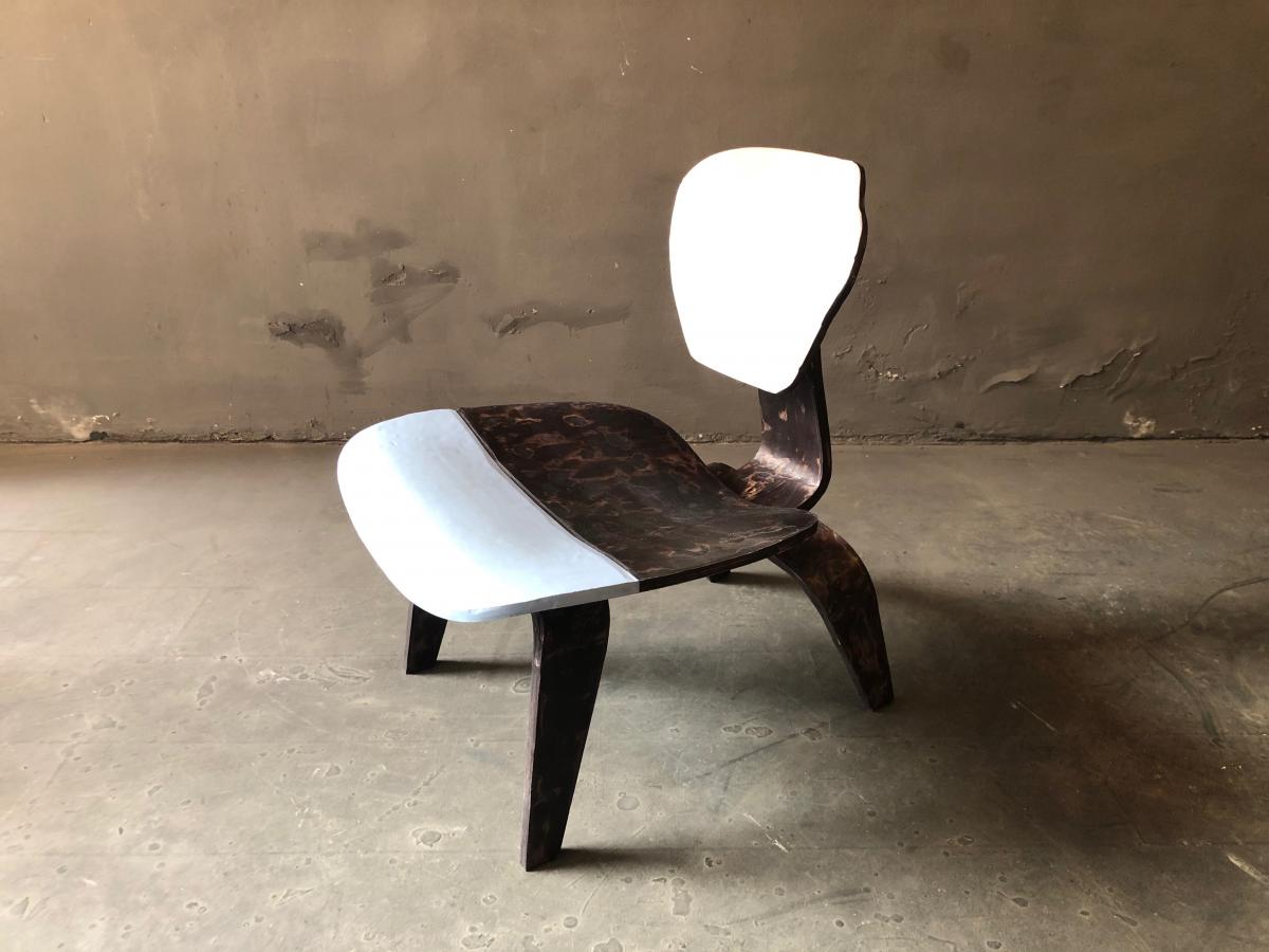 Eames Lounge Chair overworked by cutting its original shape and transform its design into a single piece of work. Painted and lacquered