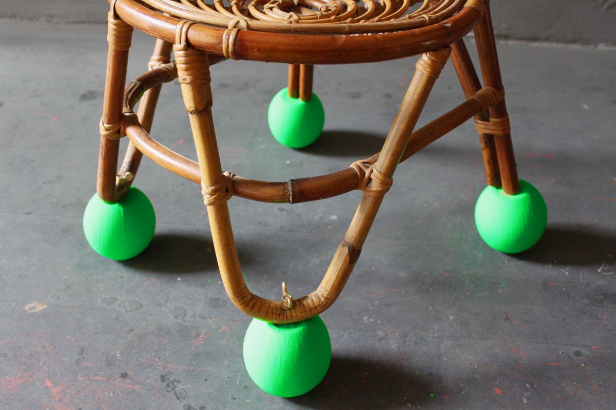 French 40's design, rattan chair contemporized with vintage wood feet and hand painted in blue and green