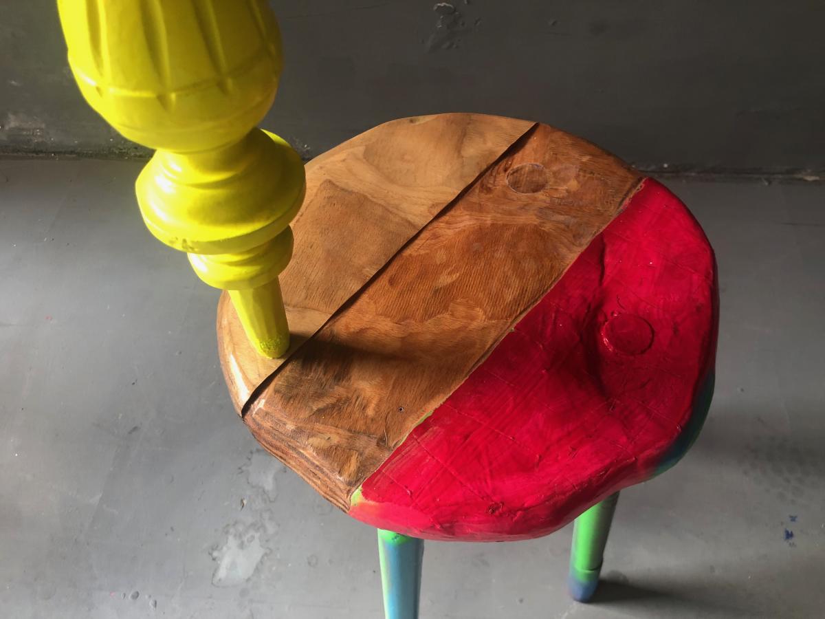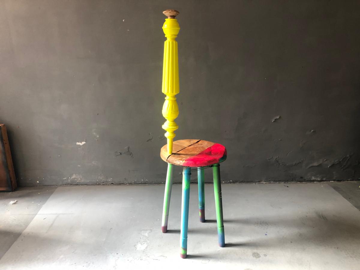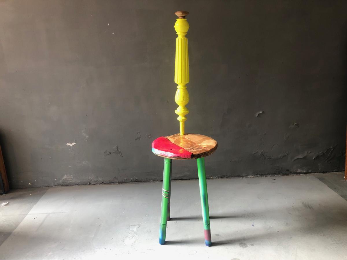 Stummer Diener "Vergangenheit schmiedet Zukunft" yellow bayerischer Stuhl, umgebaut zum stummen Diener, abgeschliffen, hand bemalt und lackiert Origin My Atelier Year 2021 State Sold PreviousNext