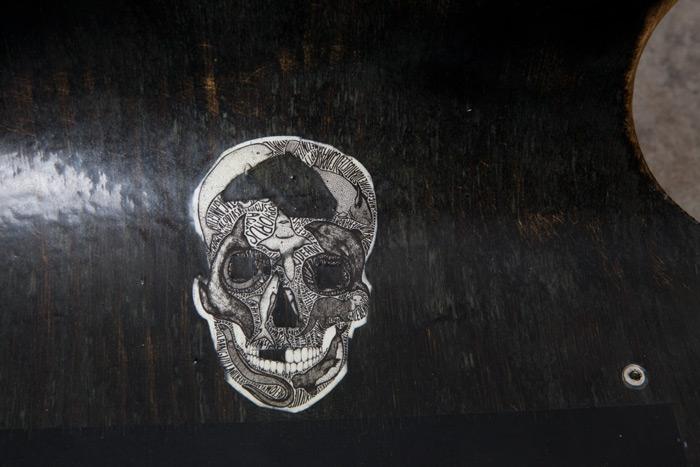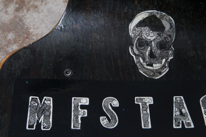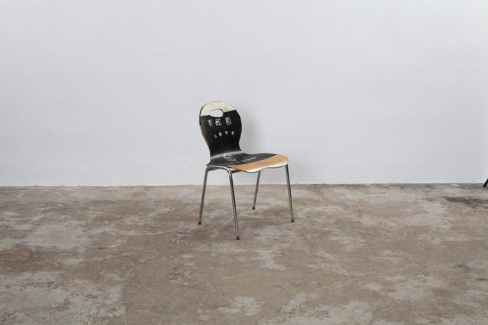 industrial  80's chair, with stickers from a graffiti artist, cut to new shape, spraypainted &  multi lacquered