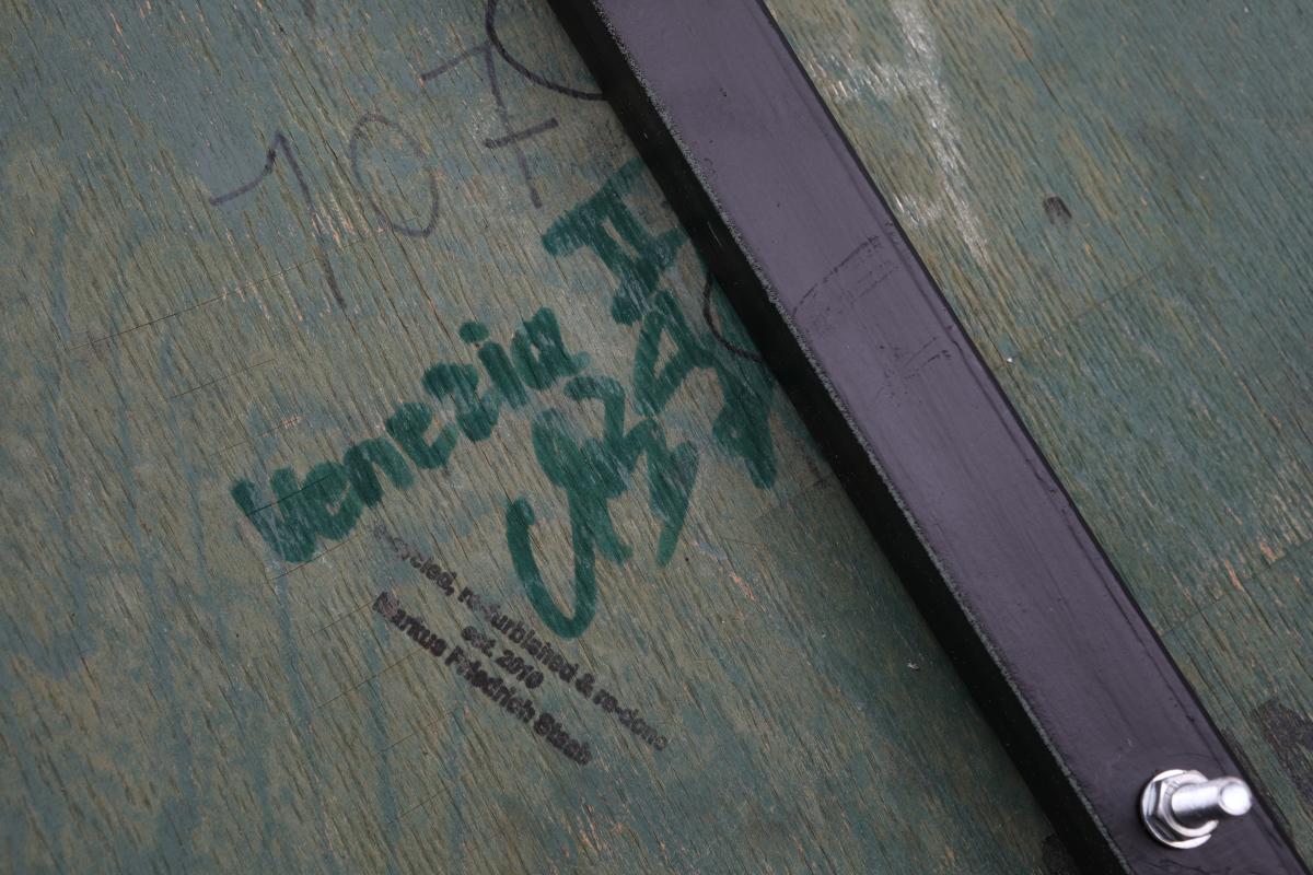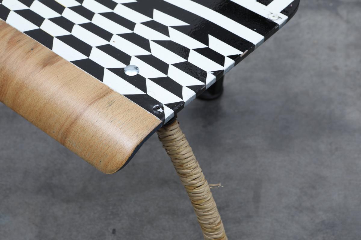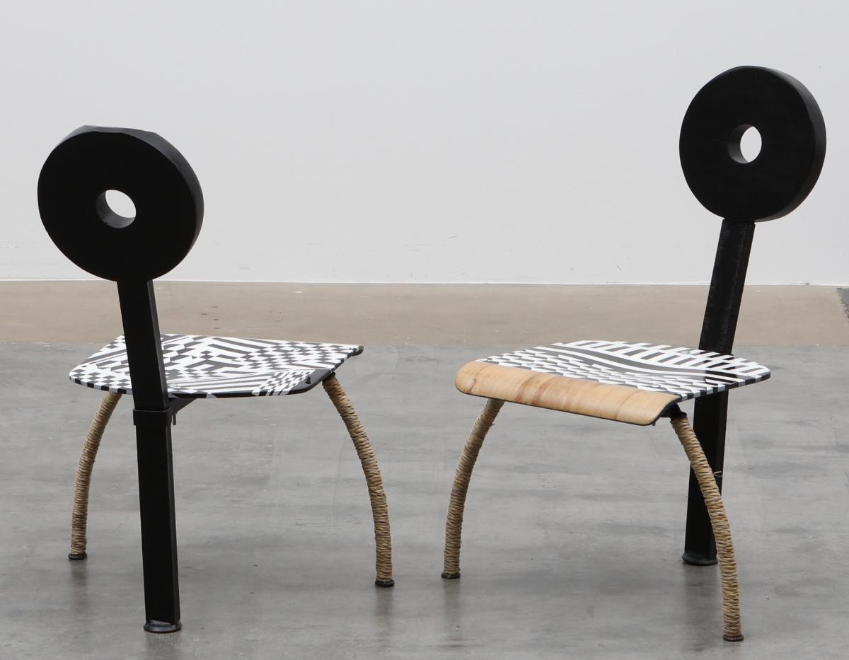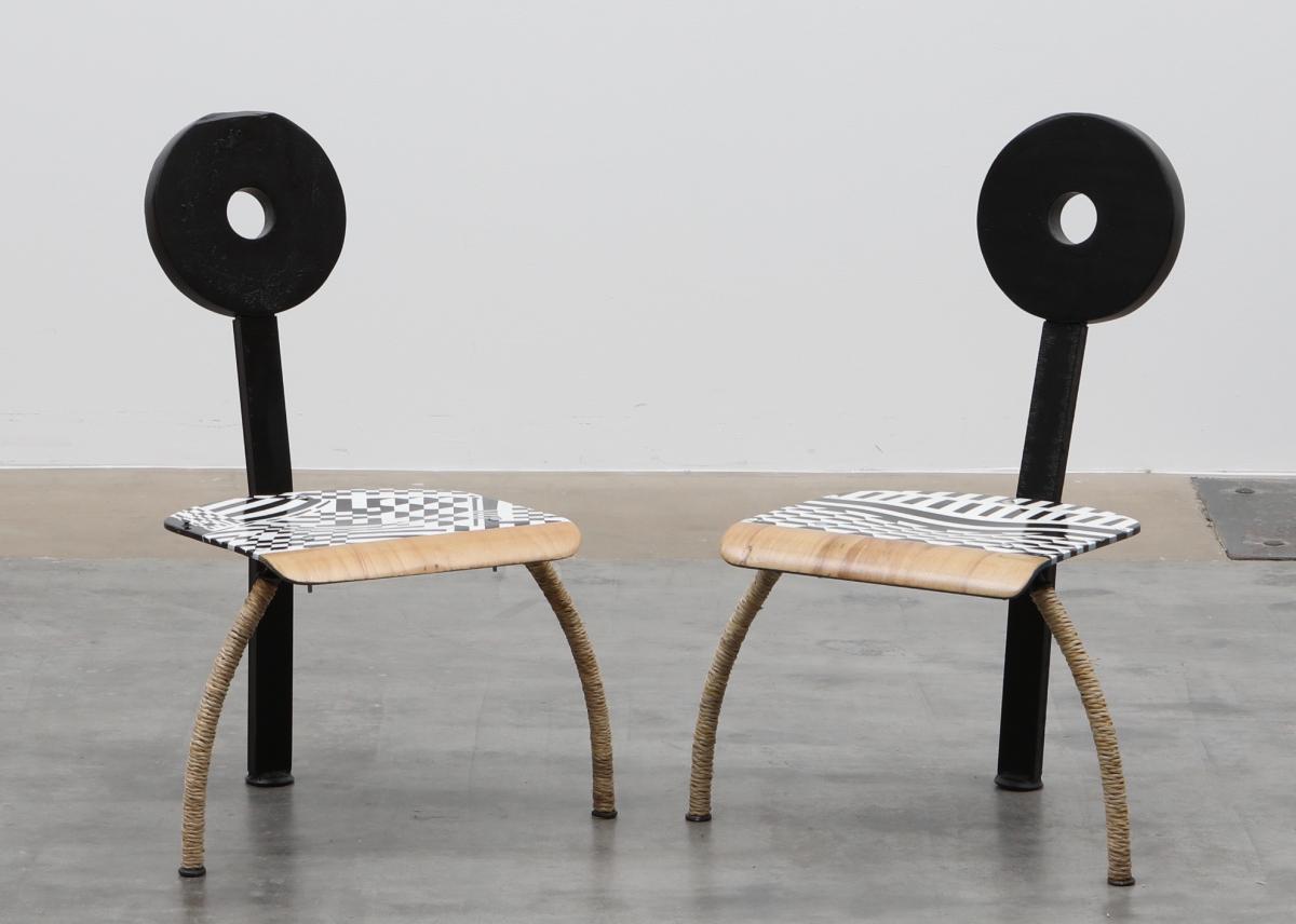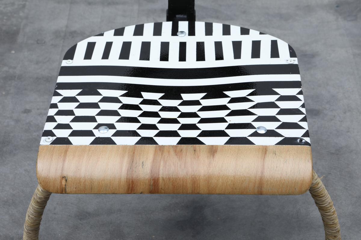 Venezia Chairs 3 leged chairs, black and white seat patterns, black frame.round wooden backrest, spraypainted, multi-lacquered in high gloss varnish Origin Berlin Year 2019 PreviousNext