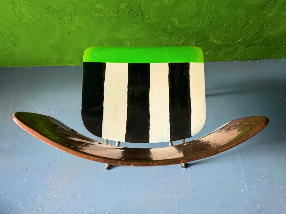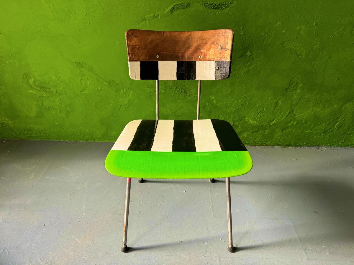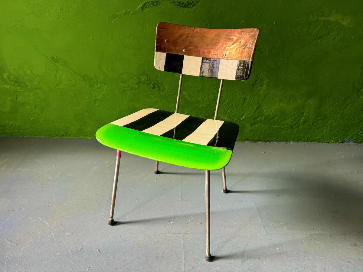 Vergangenheit schmiedet Zukunft Wim Rietveld chair contemporized, painted, multi-lacquered, galvanised backrest in bronse Origin Netherlands PreviousNext