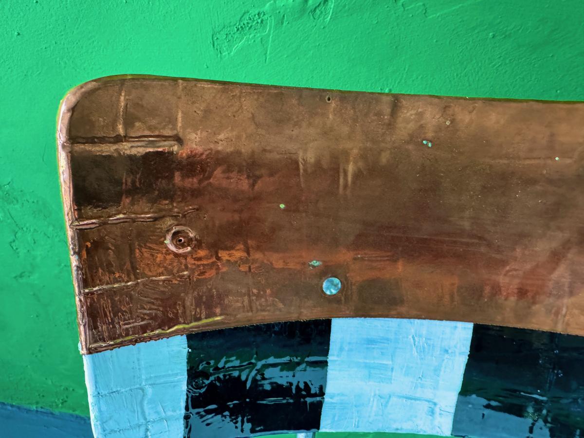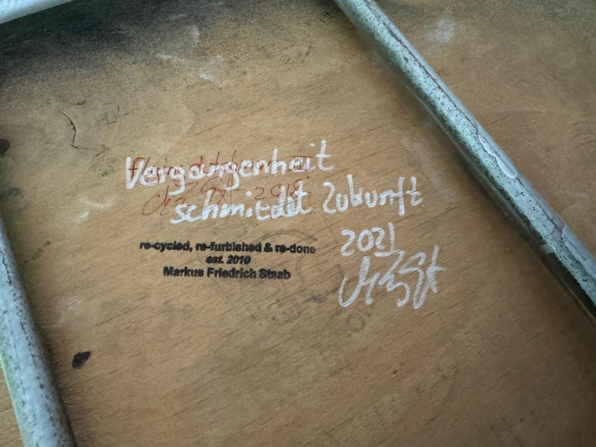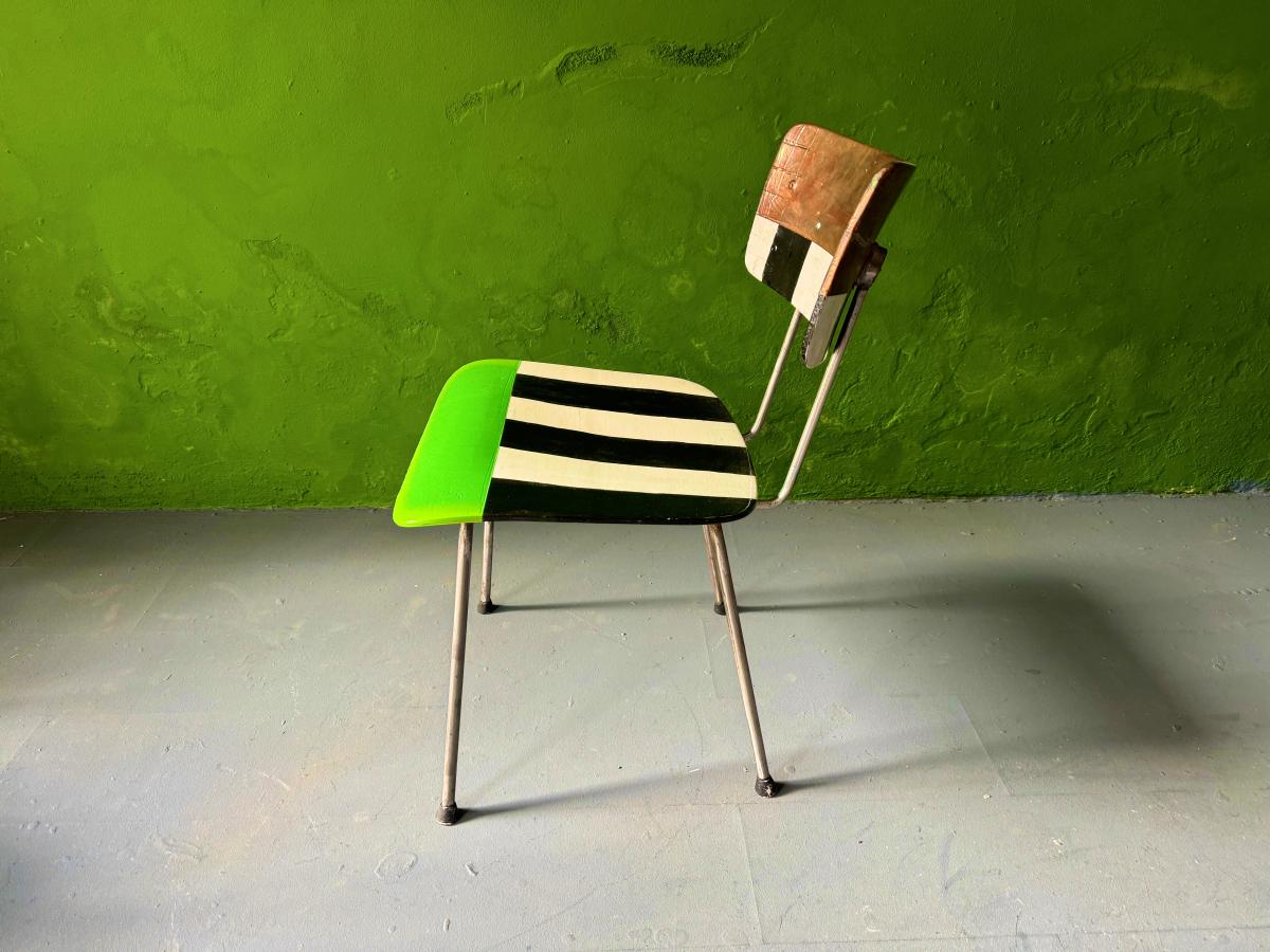 Vergangenheit schmiedet Zukunft Wim Rietveld chair contemporized, painted, multi-lacquered, galvanised backrest in bronse Origin Netherlands PreviousNext