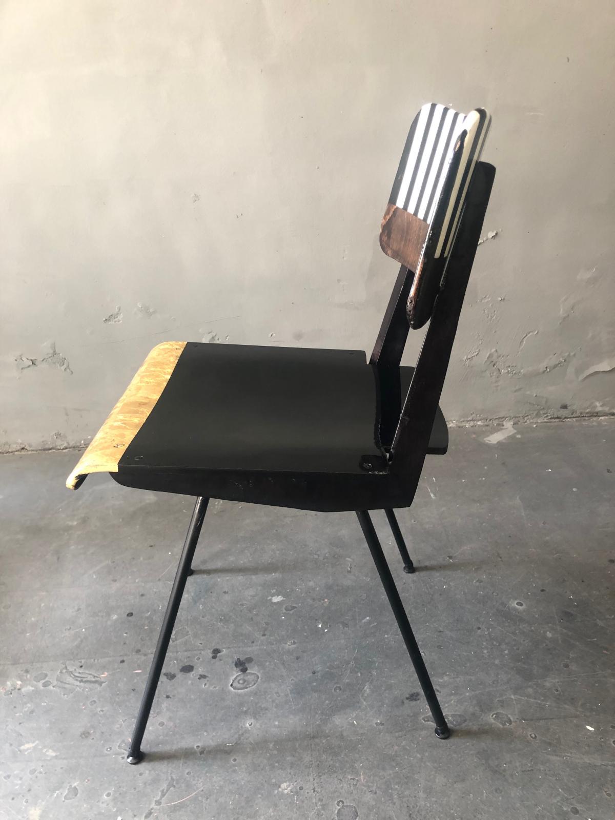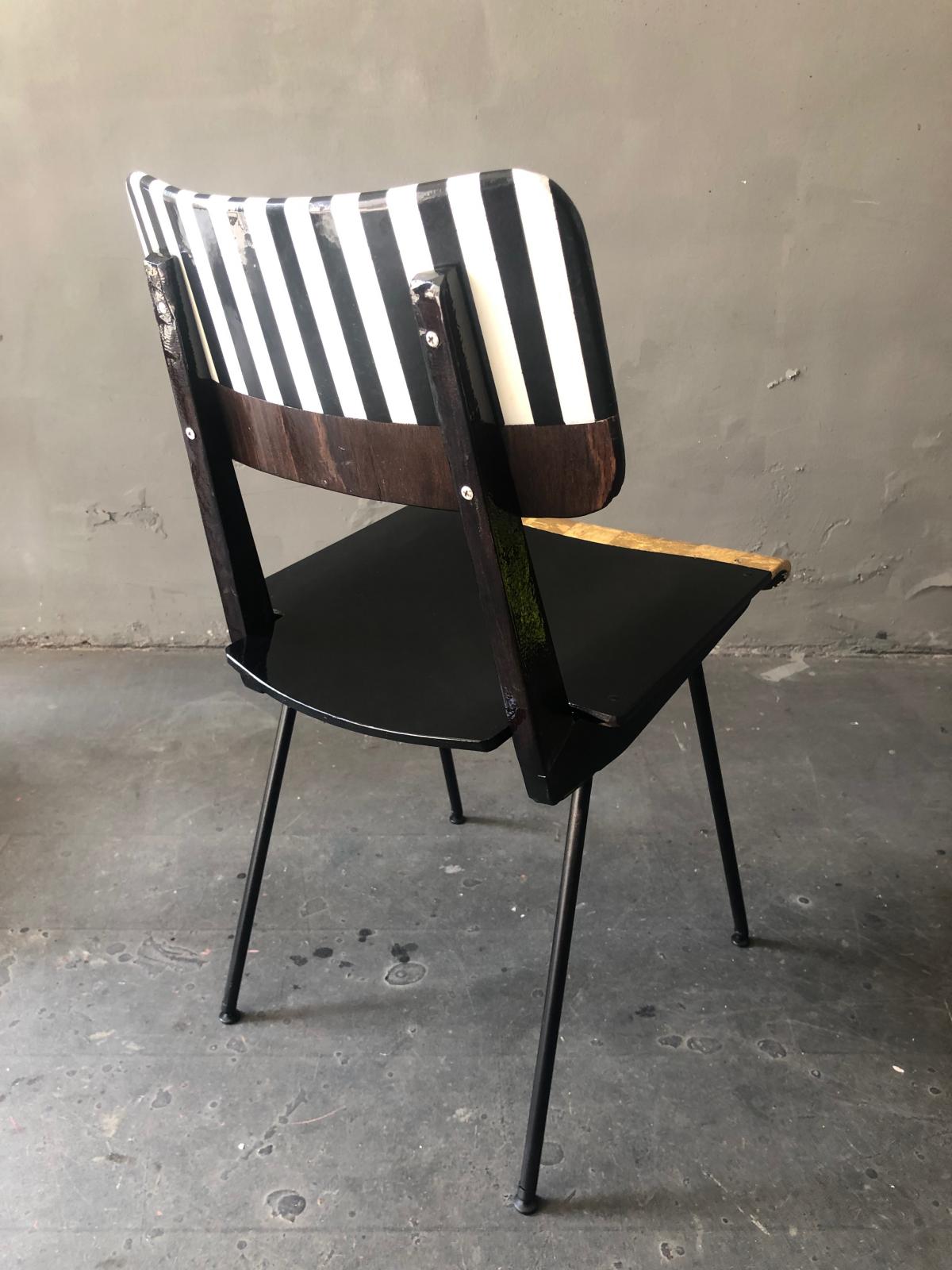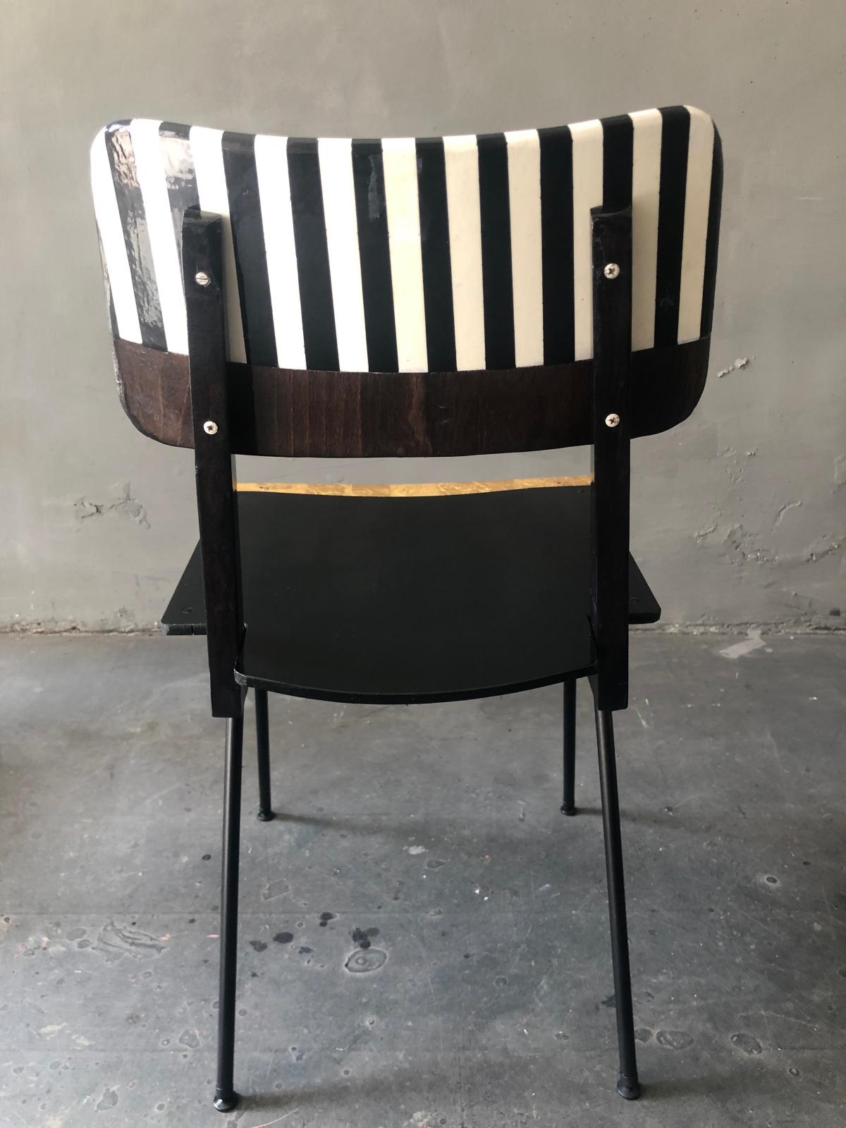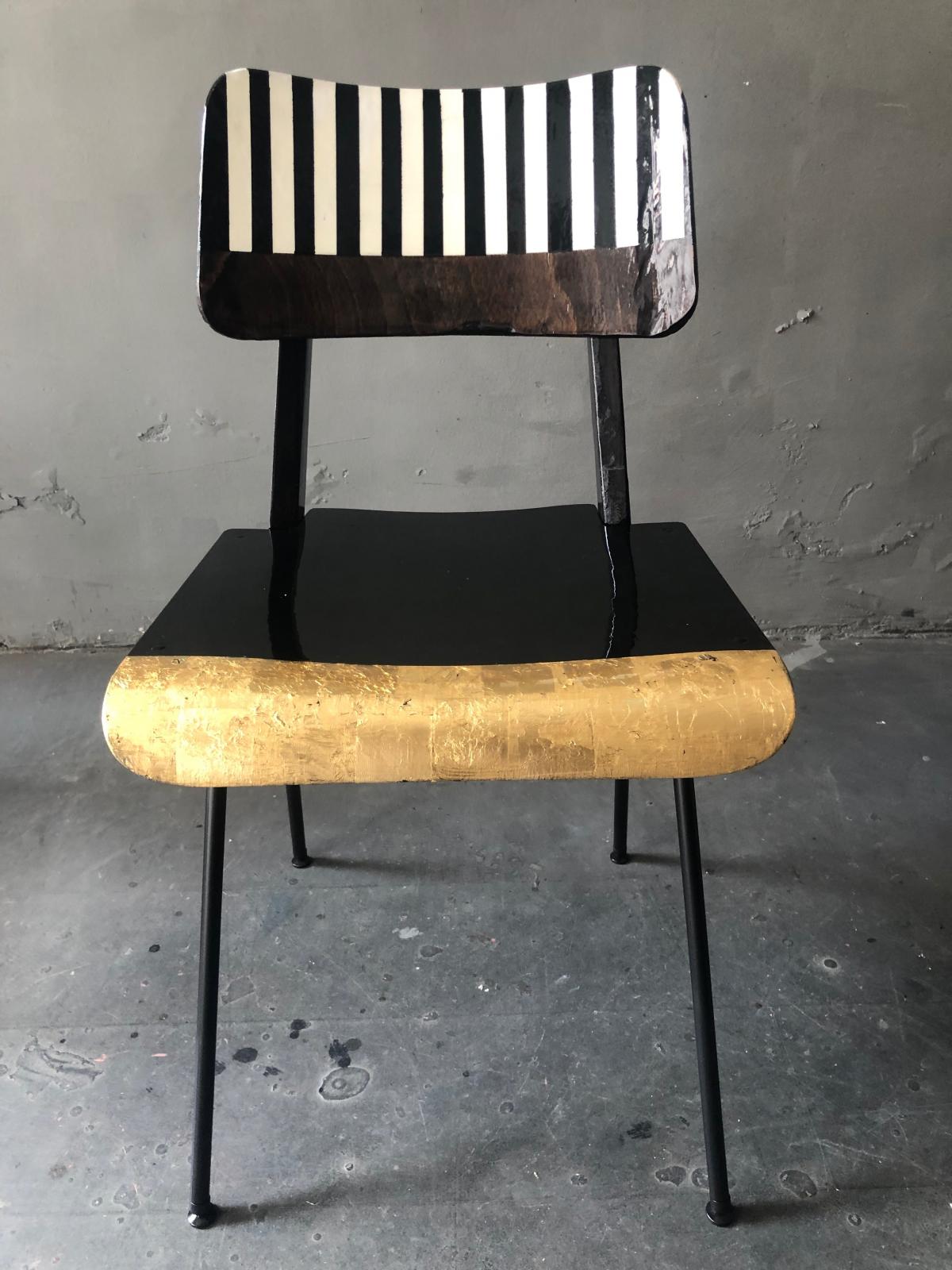 Vergangenheit schmiedet Zukunft black & white Mash up of three chairs, hand-painted in black & white, gilt-plated 24k seat, multi-lacquered in high gloss varnish Origin Bavarian Dealer Year 2021 PreviousNext