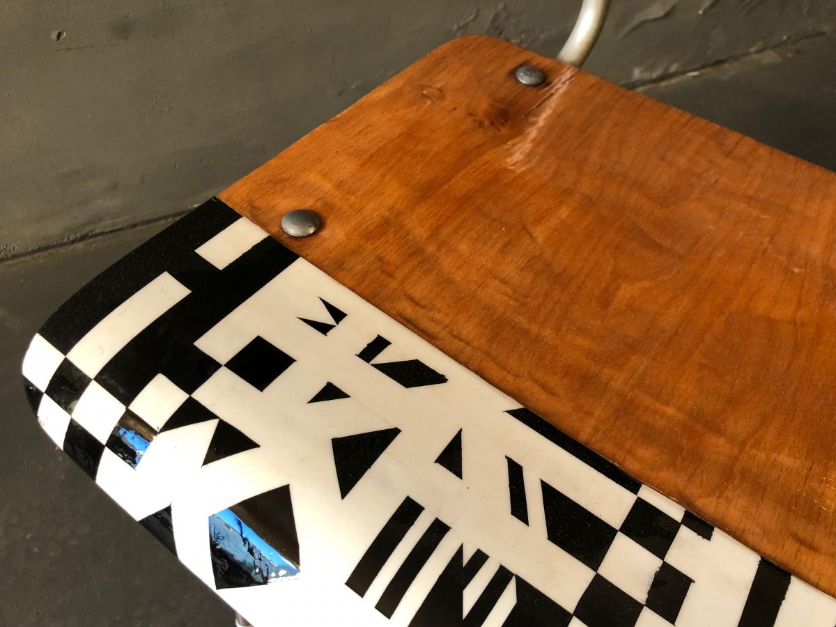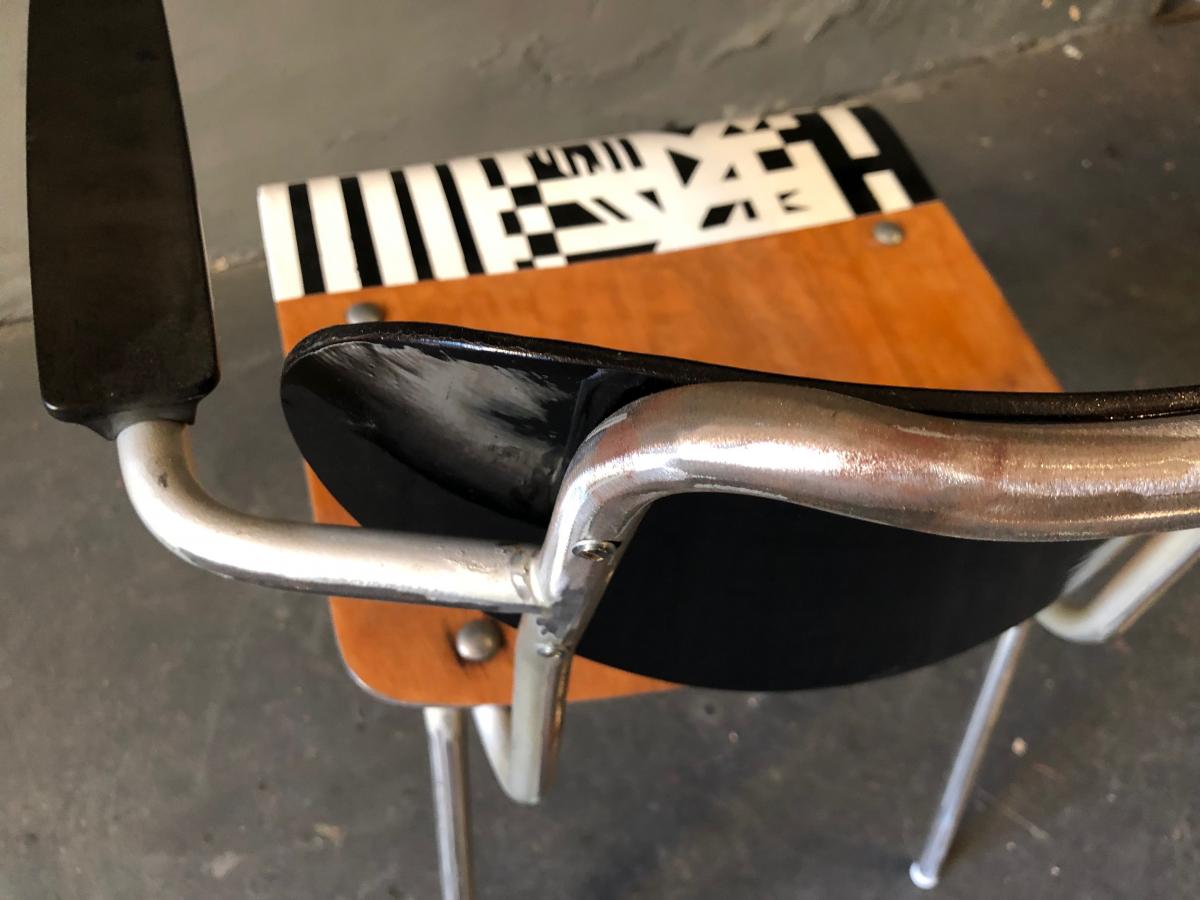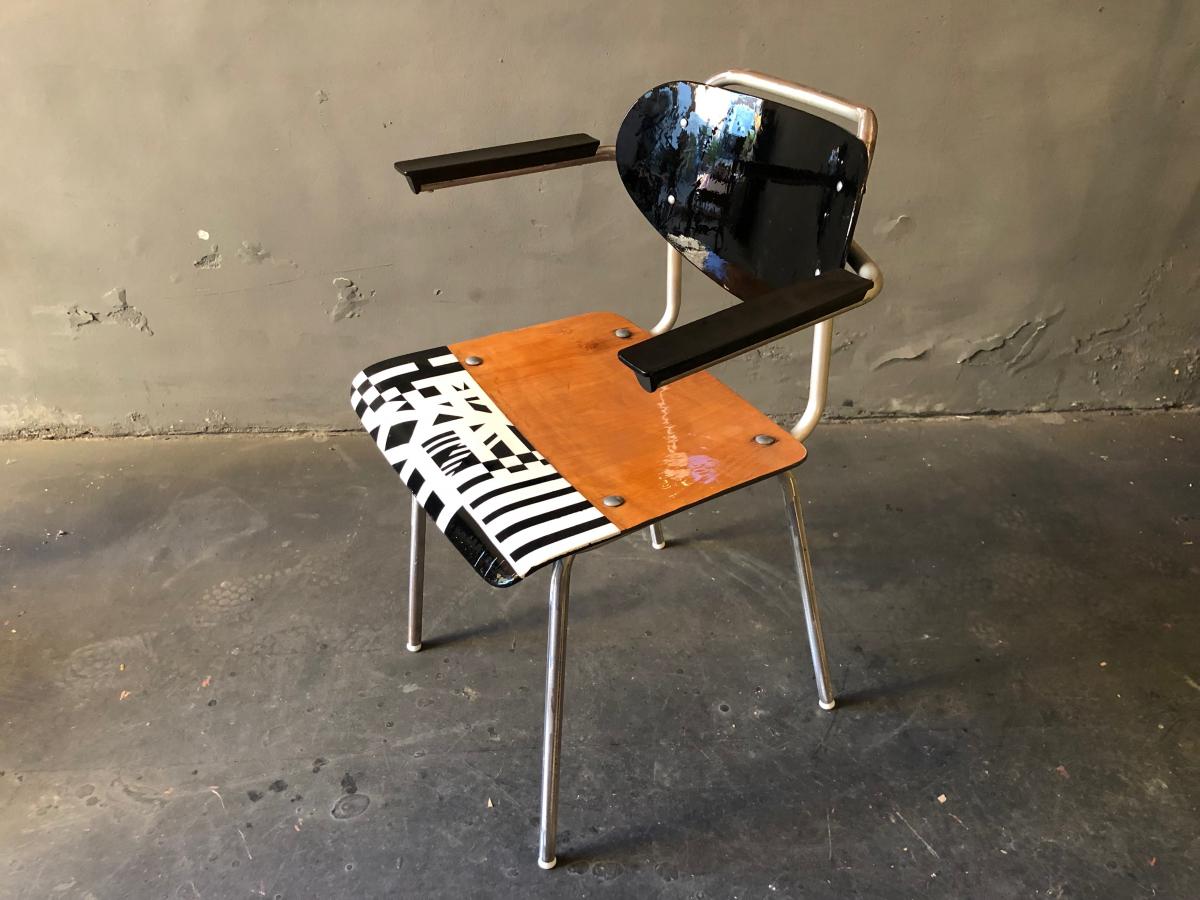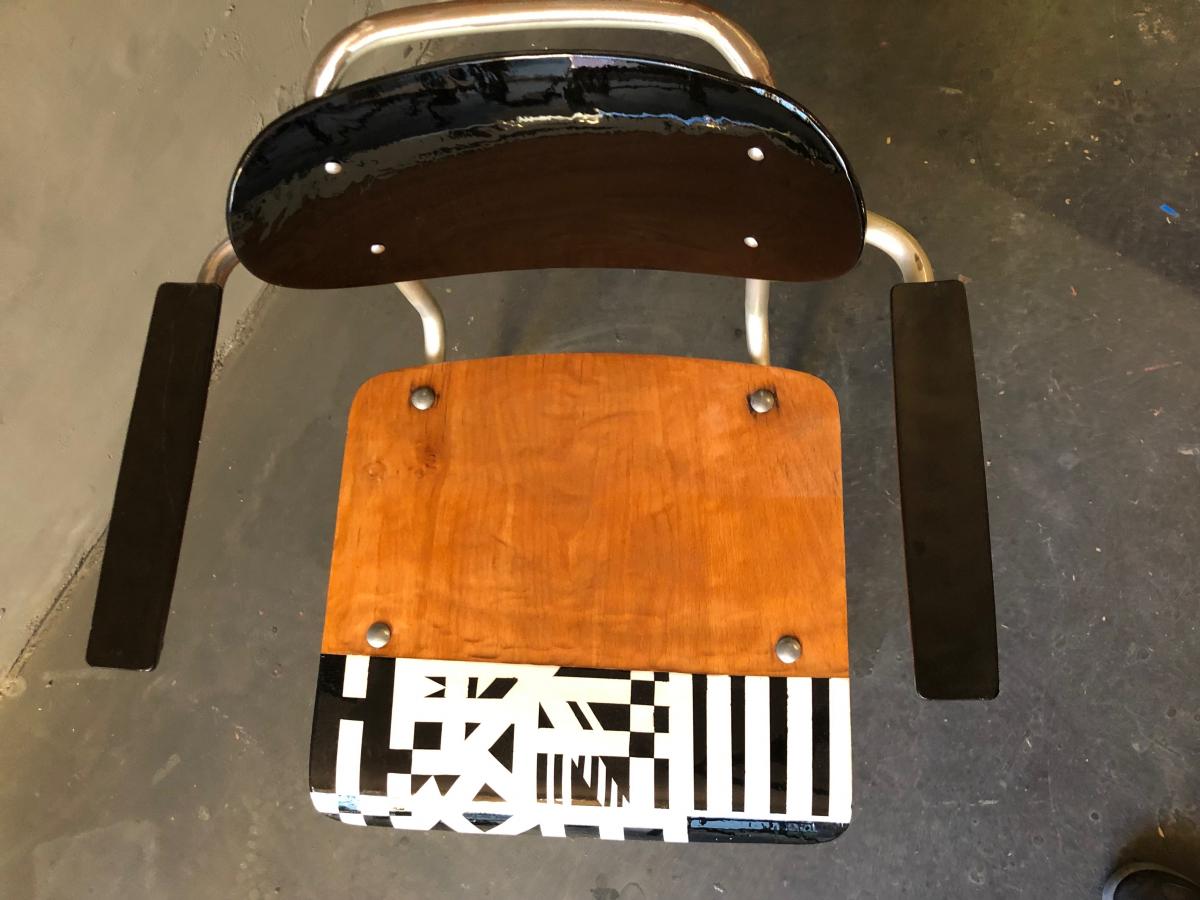 Niederländisches Design "contemporised", schwarz weißes Muster auf Sitzfläche, ersetzte Rückenlehne, mehrfach in Hochglanzlack lackiert