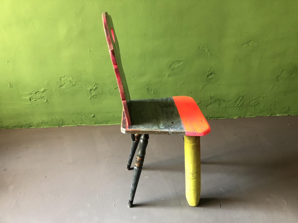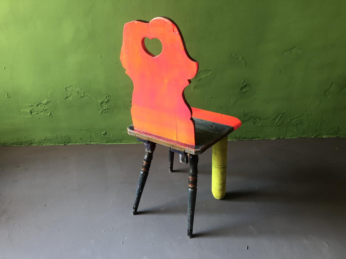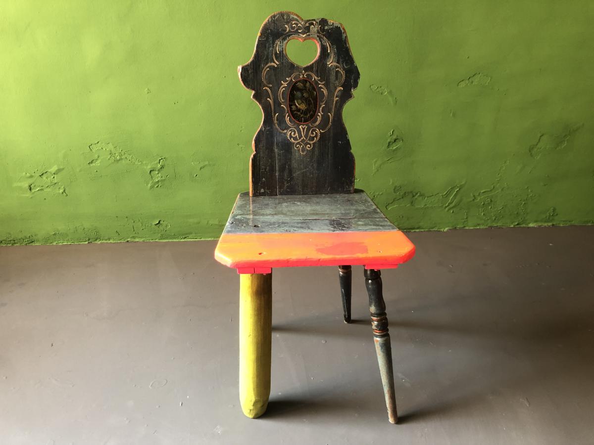 Vergangenheit schmiedet Zukunft/Distelfink Chair from ca. 1780 with painting on the backrest contemporized, leg added, painted and multi lacquered Origin Bavaria Year 2022 State Sold PreviousNext