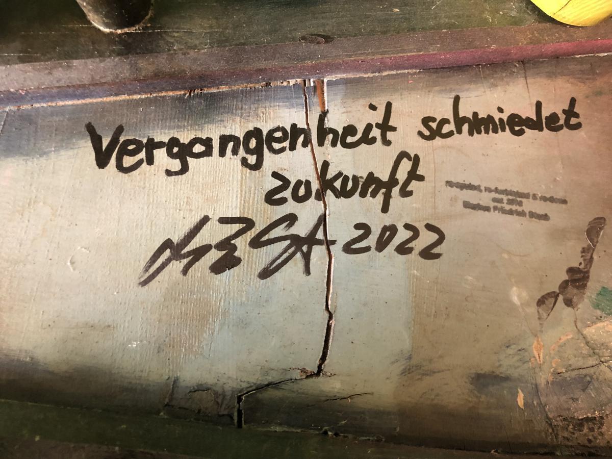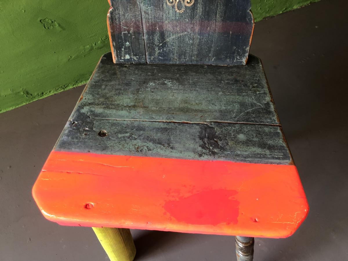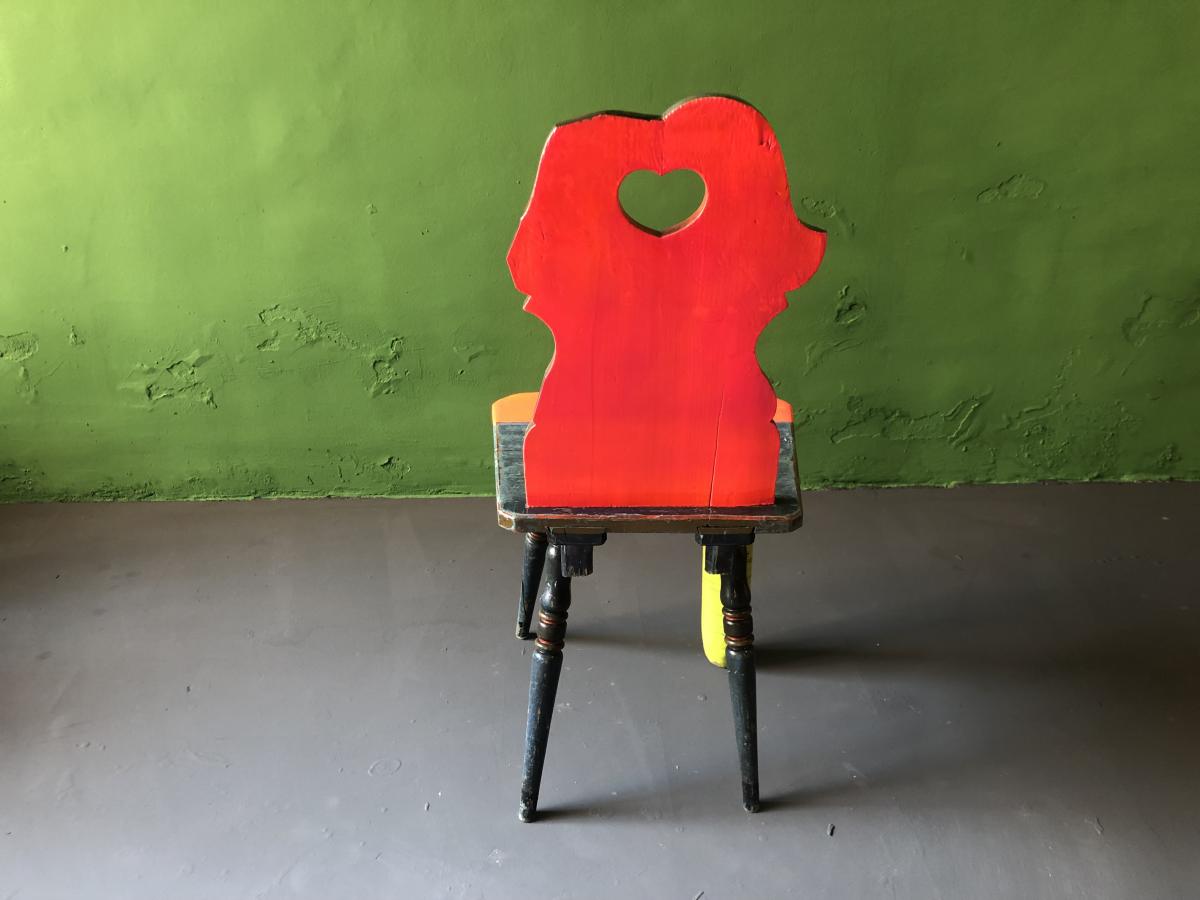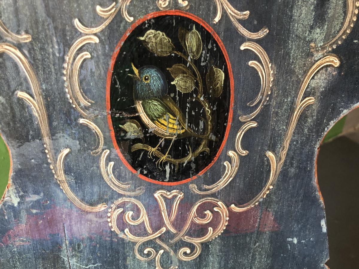 Vergangenheit schmiedet Zukunft/Distelfink Chair from ca. 1780 with painting on the backrest contemporized, leg added, painted and multi lacquered Origin Bavaria Year 2022 State Sold PreviousNext